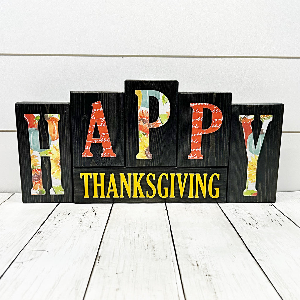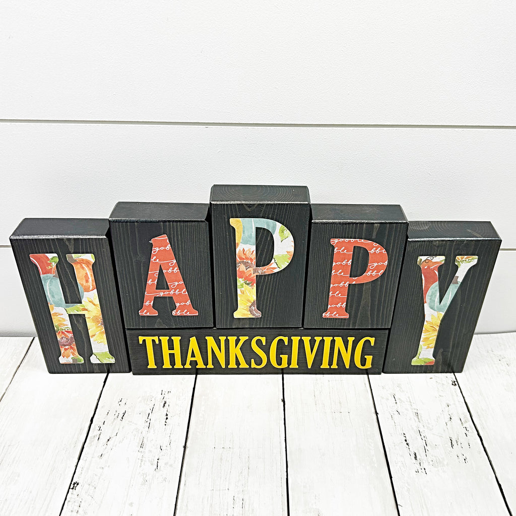 The blocks are cut from 2x4 inch pine and vary in height from 4-1/2" to 6-1/2". The whole set measures 17-1/2" wide and 8" tall at the middle block. The blocks are stained and the letters for "merry" and "happy" are applied with patterned paper (the order of the patterned papers may vary by set but will be consistent with the patterns shown). Christmas and Thanksgiving are applied with vinyl. The blocks are then sealed for protection. **Please note that variations in wood are considered part of its natural character and adds to the distressed, rustic look of each block.