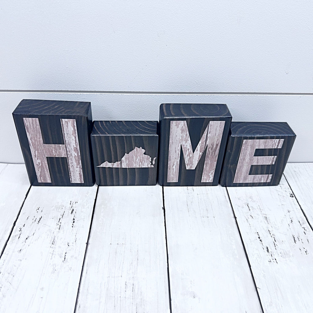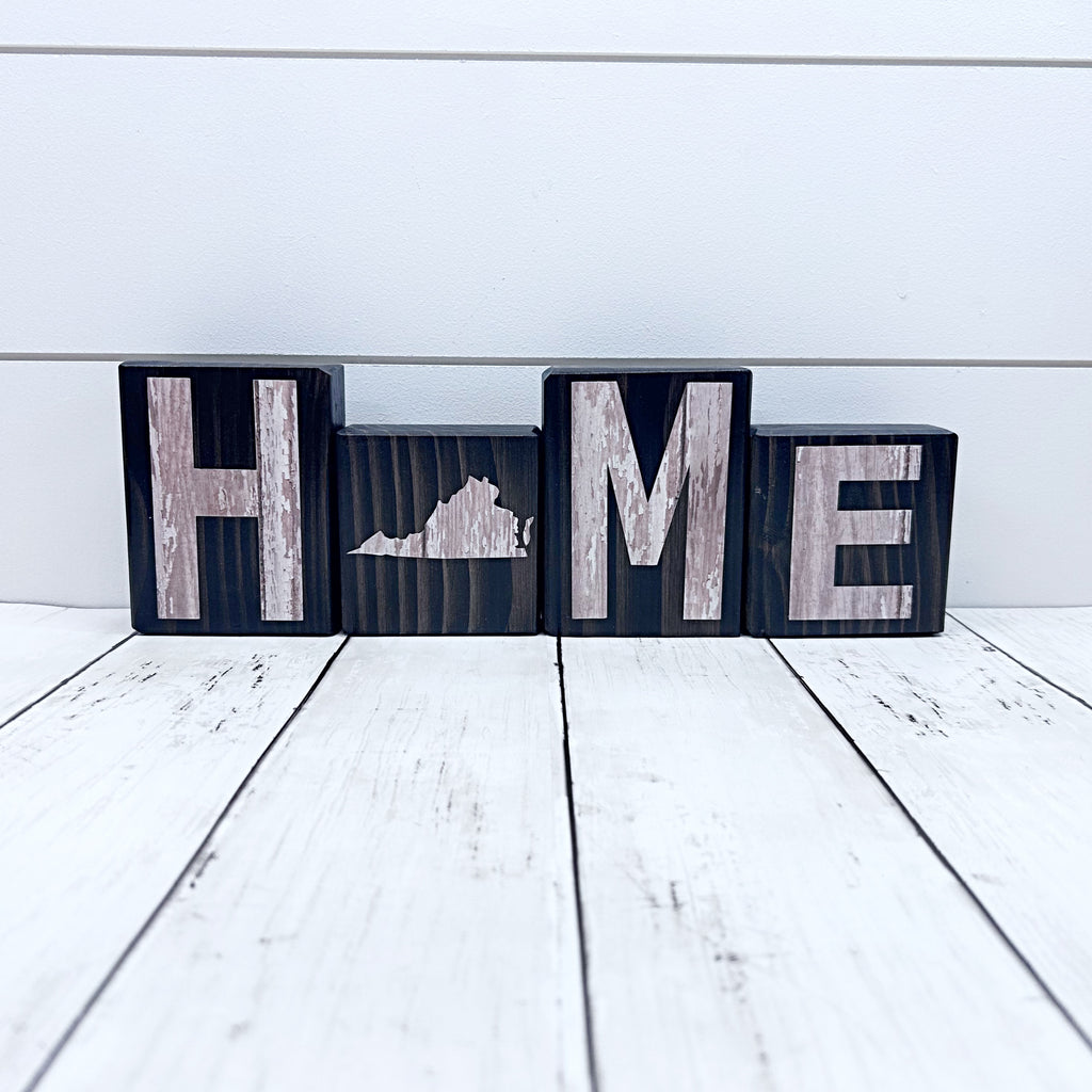 Show your state pride with these rustic wooden Virginia HOME letter blocks! They would make a great addition to your shelf, mantle or tabletop décor or a great gift! These blocks show the phrase HOME with the state of Virginia as the “O”. The letters are cut from a light wood grain patterned paper.